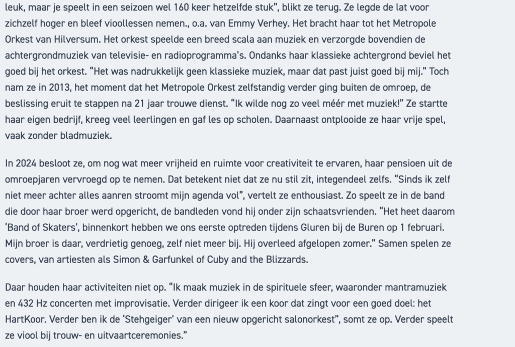 In augustus heb ik opgetreden in de Andrieskerk in Amerongen: ‘Le Cygne’ van Saint-Saëns en ‘Meditation de Thaïs’ van Massenet, begeleid door Peter Neeteson. Wat niet op het programma staat te lezen, is dat ik die dag ook de Czardas van Monti heb gespeeld, en Spaanse liedjes met gitarist Mateo Alvarez. Dit ter gelegenheid van Peter Neeteson’s verjaardag.